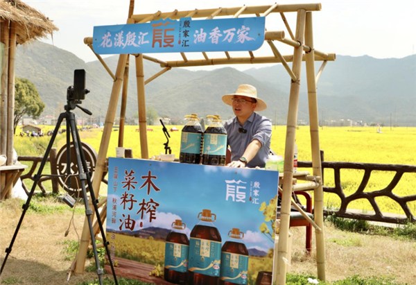 汪静口中的“小鲍同志”,正是殷汇镇联丰村党总支书记鲍张君。这位做了3年自媒体、为当地直播带货销售额超百万元的村干部,当天把直播间搬到了油菜花田旁。和他一起在现场直播带货的还有3位网红,大家一边推介殷汇美景,一边销售菜籽油,直播间里人气高涨、订单不断。截至当天下午,销售额破万元。如今,直播带货已成为殷汇镇农产品出村进城的重要渠道,一批本土“网红”正为乡村振兴注入新活力。