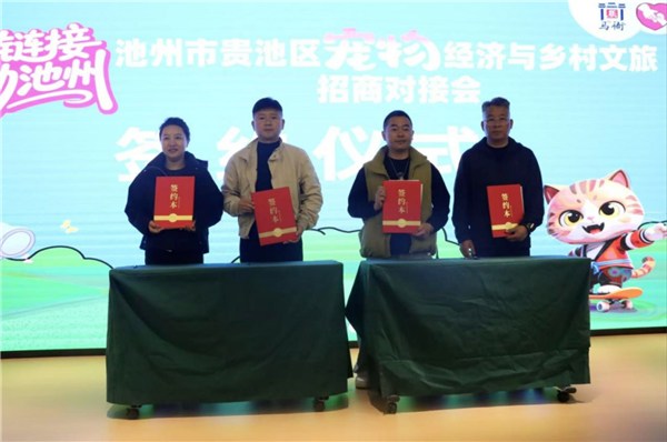 活动现场,精彩的非遗乌石手狮舞以及喵星人投票环节接连上演,憨态可掬的金山猫村专属IP“小金牙”也正式亮相,现场各种软萌可爱的猫咪更是引得大家纷纷驻足围观,气氛十分热烈。在推介环节,区文旅局围绕全区优质文旅资源,重点推介了涵盖康养文旅、民宿度假、文化体验等多元业态的招商项目,全方位展现了贵池文旅产业的发展潜力。马衙街道文旅推荐官则聚焦金山猫村,从打造历程、特色业态、运营成果与招商规划等方面进行详细介绍,生动呈现了“文创+宠物经济”乡村振兴新路径的活力与魅力。随后,多个宠物产业链配套项目、乡村文旅融合项目现场签约,研学实践、校企实训、产业合作等多类基地同步揭牌,为贵池宠物经济与乡村文旅融合发展再添新动能。