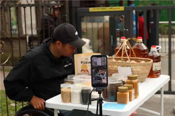 “欢迎新朋友来到我的直播间,这里有正宗的土鸡蛋、土蜂蜜、菜籽油,大家可以了解一下……”在清溪街道富景垚小区北门一处摊点上,摊主江壮正对着手机直播,热情地介绍自己的农产品。小区门口怎么可以摆摊?这位摊主有何特殊之处?原来,这个摊位是该街道南湖社区联合城管、物业等多方力量共同为他搭建的“爱心售货点”。