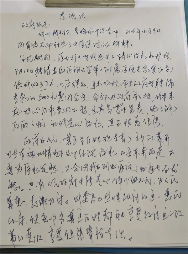“手术顺利,而且政府对聘请专家的费用全免,全部由政府承担,我本来就担心治疗费用不够,这真是雪中送炭,给我解了后顾之忧,让我安心治疗,直至恢复健康……”这封手写的感谢信,出自一名77岁的老人钱来清,他刚刚在池州市中医医院做完肾结石手术,苍穹有力的字迹里透着滚烫的谢意。