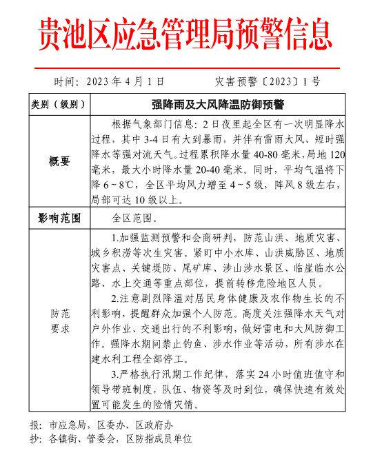 【预警信息】贵池区应急管理局预警信息(2023年第1期)
