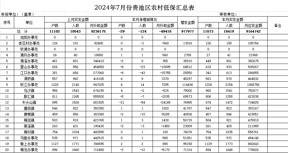 贵池区2024年7月份农村低保汇总表