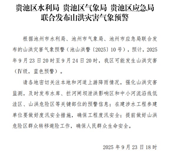 名称: 贵池区山洪灾害气象预警信息(贵山洪警〔2025〕10号) 文号: