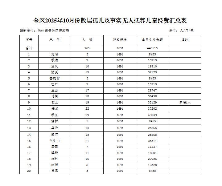 贵池区2025年10月份散居孤儿供养经费发放汇总表