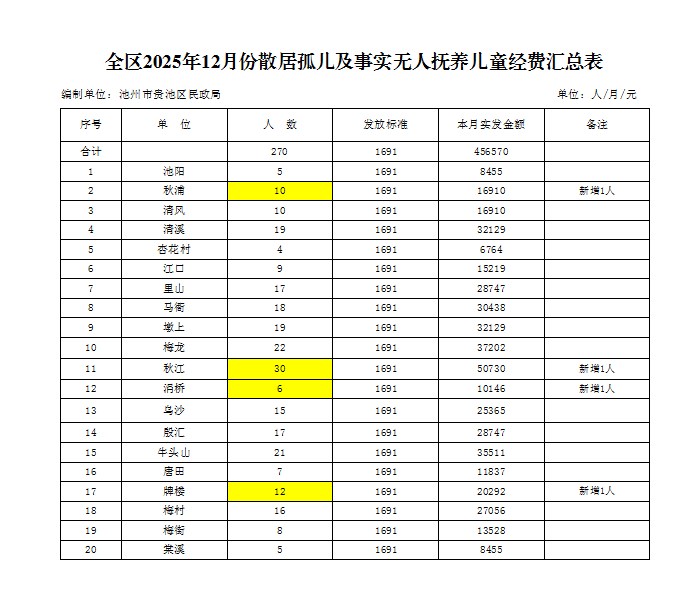 贵池区2025年12月份散居孤儿供养经费发放汇总表