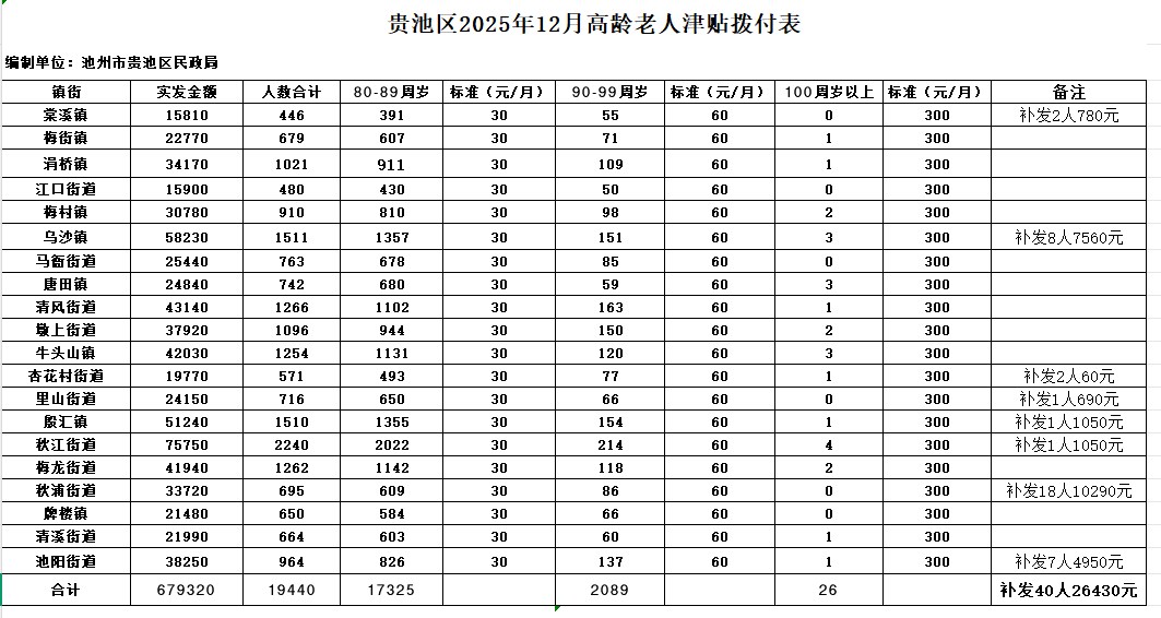 2025年度贵池区12月份高龄老人津贴资金汇总表