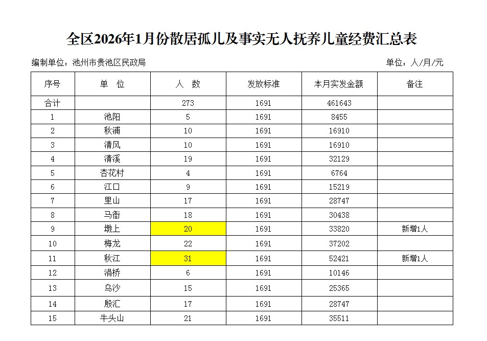 贵池区2026年1月份散居孤儿供养经费发放汇总表